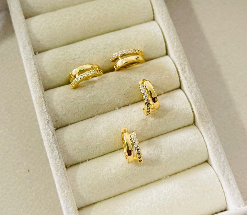 ARGOLA G DUAS FILEIRAS VINTE ZIRC. BANHO DOURADO