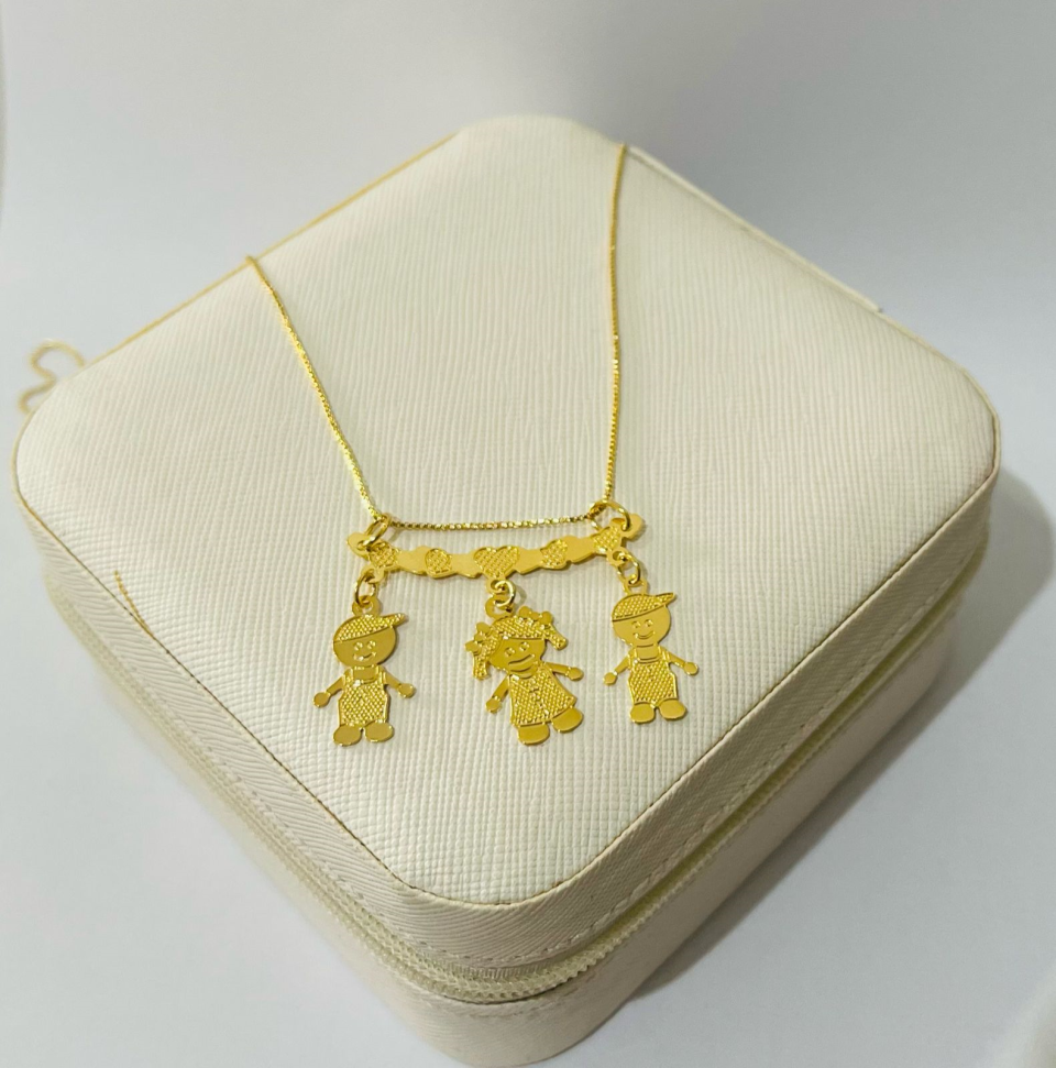 PINGENTE DOIS MENINOS E UMA MENINA FRIZ BANHO DOURADO